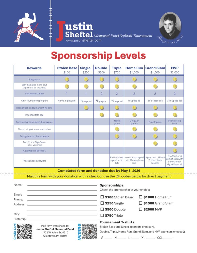 We invite you to join us as a sponsor of the 22nd Annual Justin Sheftel Memorial Softball Tournament, held Saturday, June 20, 2026. This tournament is more than a tradition—it’s a living tribute to Justin’s character and the values he modeled: humility, perseverance, friendship, and heart.